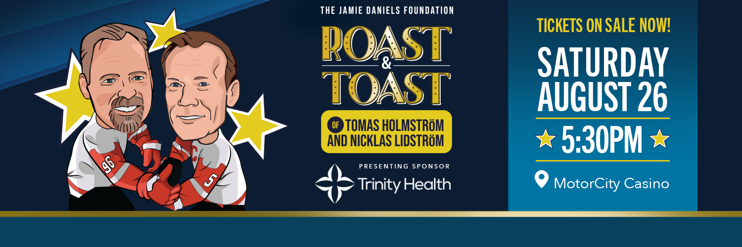 Special thanks to Tomas Holmstrom and Nicklas Lidstrom for allowing us to center our event on their impeccable careers, our dedicated event committee, the Mike & Marian Ilitch Foundation for being our dinner sponsor, and Trinity Health – our generous presenting sponsor. We appreciate your continued support of the Jamie Daniels Foundation.